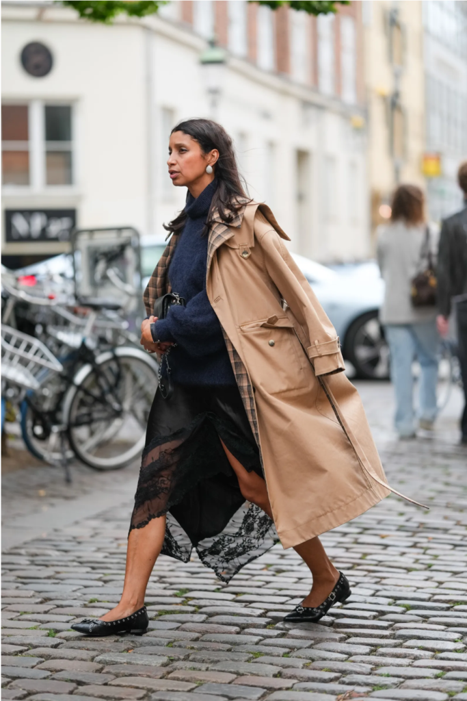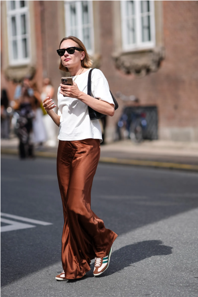 Simple, thin-strap heels, a sheepskin bag, or metallic jewelry can all add a modern touch to an ethereal satin look. For cooler weather, pair it with tall boots and a long coat for warmth and style.