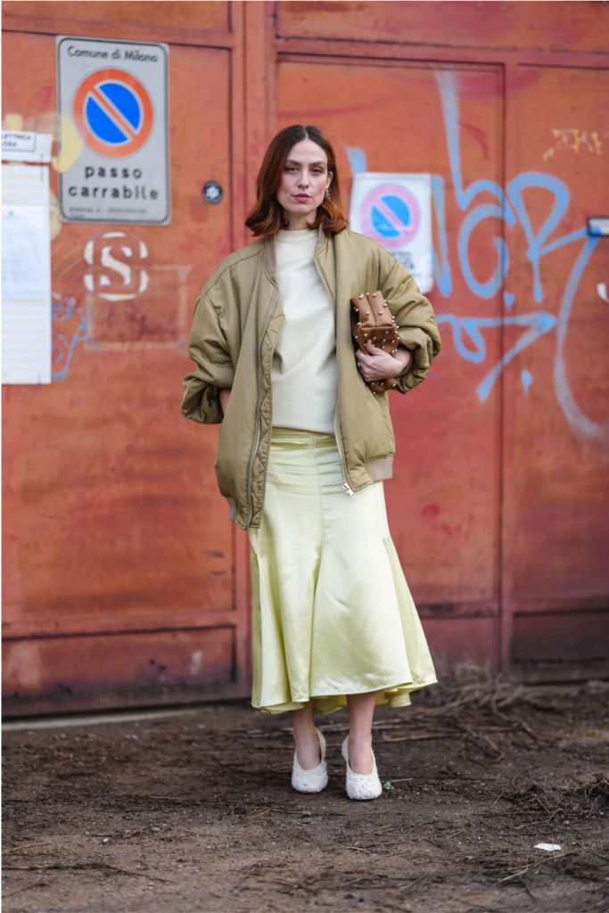 Pairing with a contrasting top or a printed jacket elevates the satin skirt’s sweetness and creates a layered, stylish look.