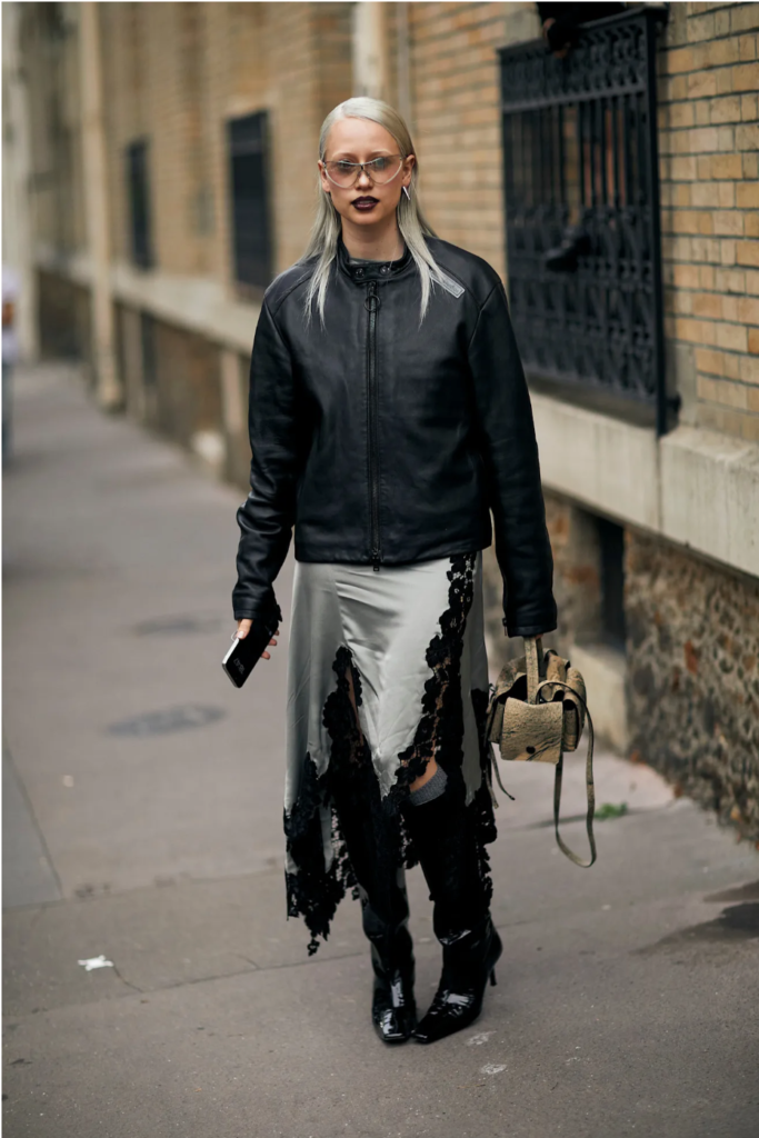 Interweave different textures with a leather coat, knit cardigan, or denim jacket to break up the softness of a satin skirt and add richness and drama to the overall look.
