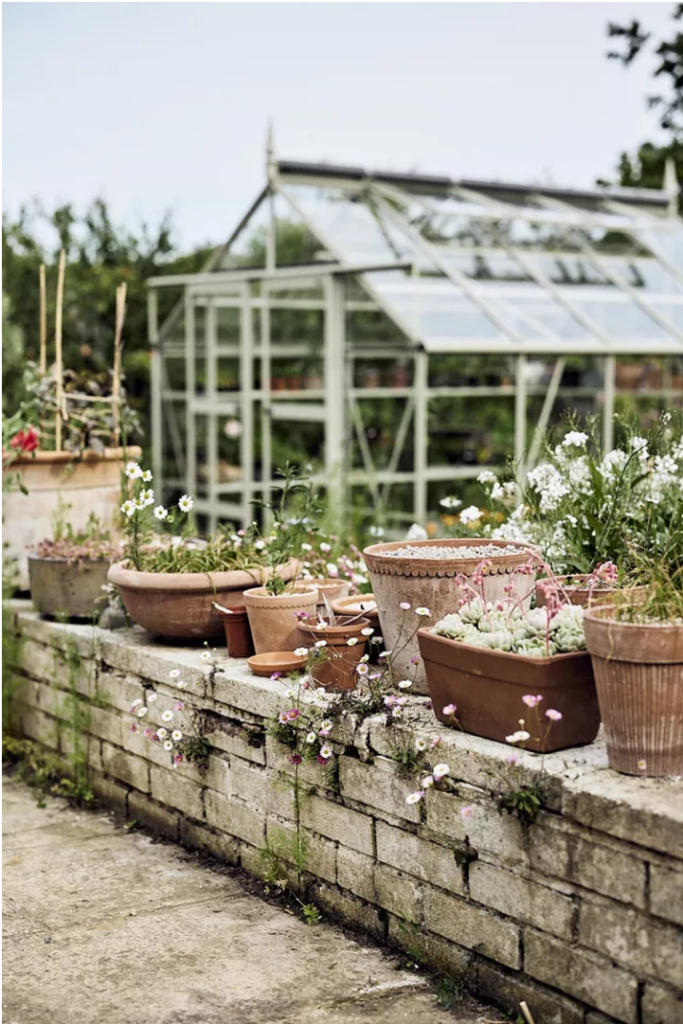 Integrate greenhouses, garden sheds, and tool sheds into the overall landscape by filling them with climbing plants and painting them in restrained earth tones. Refined details like vintage doorknobs and wrought iron hinges also lend a rustic charm.